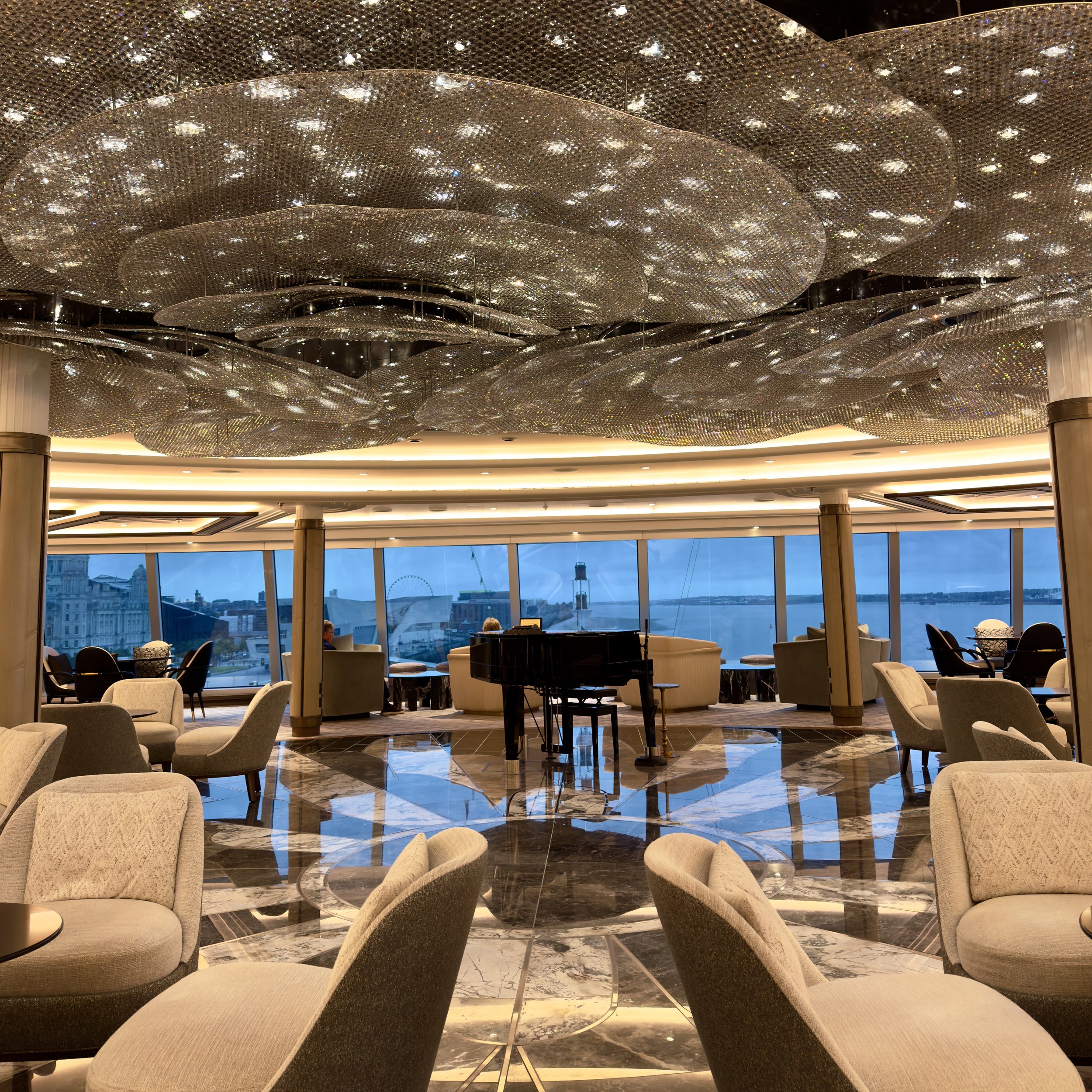 Our journey began in Liverpool where we had an overnight stay before setting off on our week long voyage. The moment we stepped aboard Regent Grandeur, it felt like entering a floating art gallery with champagne on arrival. We headed directly to our lovely veranda suite on deck six to unpack and settle in before exploring the decadent Grandeur. Finishing our self guided tour at the lofty Observation Lounge, with its panoramic windows, jazz piano and sleek bar, and the next door Library, which quickly became our official βreading and relaxation spotβ.