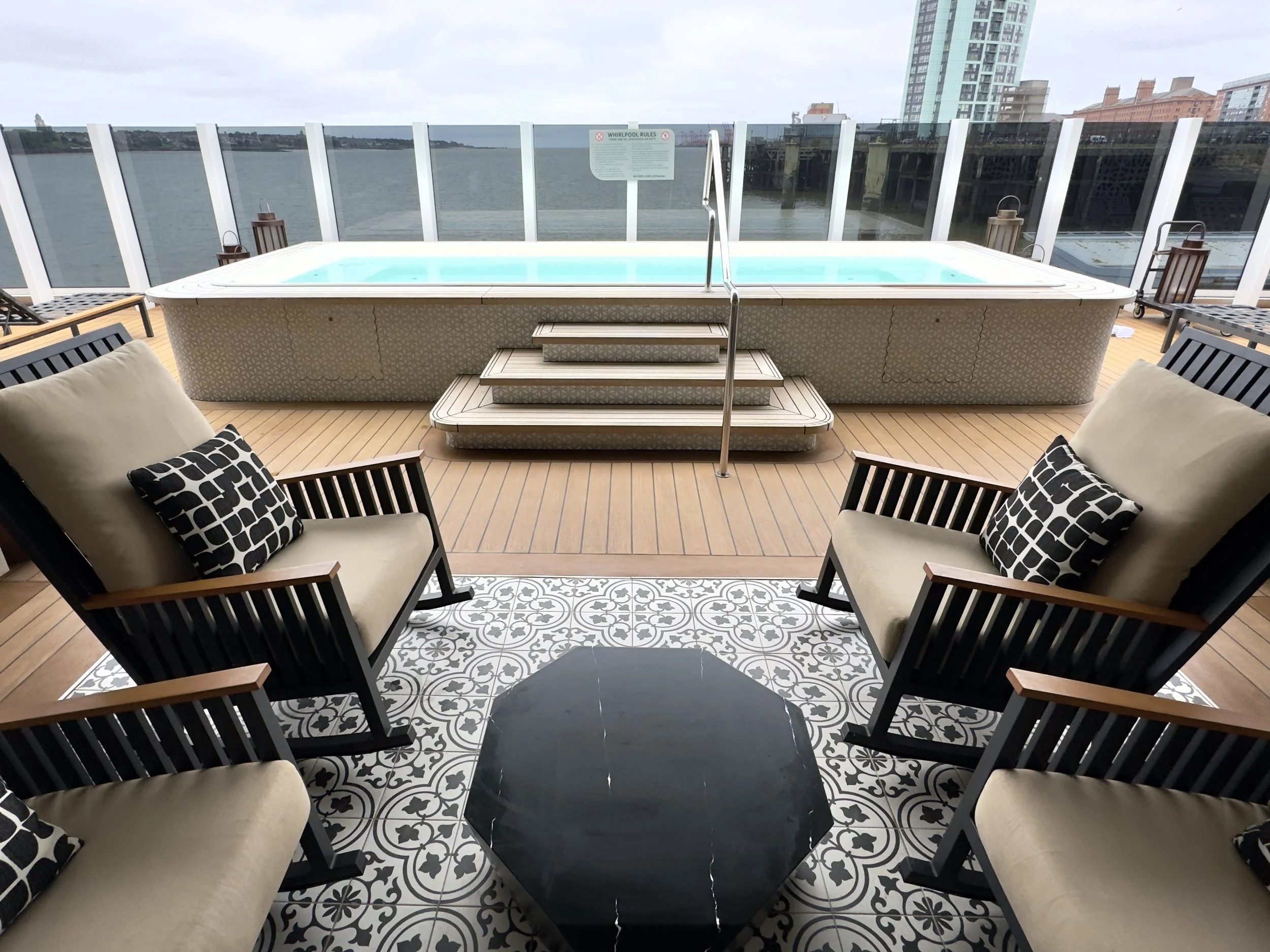 The afternoon was spent making the most of a glimpse of a British summertime by relaxing around the sumptuous pool deck with a glass of champagne as we soaked in the warmth of one of the hot tubs.