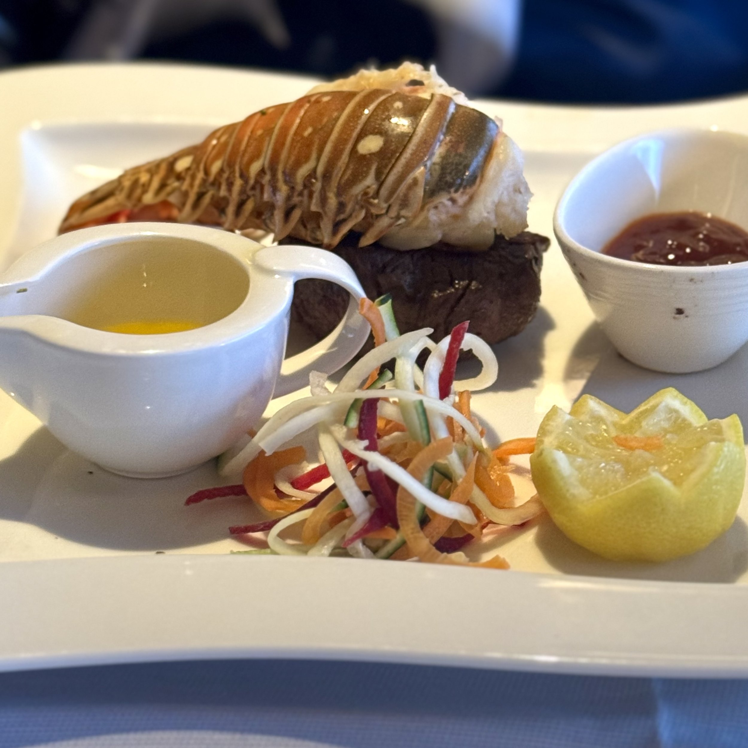 In the evening dinner, the space transforms into something rather special. The menu is expansive featuring classic favourites (lobster tails, beef Wellington, seared scallops) as well as βdesign your ownβ creations, where you choose the protein, sauce, and sides. Think of it as luxury Γ la carte, with the freedom of a bespoke menu. Service is quietly attentive and never rushed, the wine flows freely, and the setting is every inch as glamorous as the food.