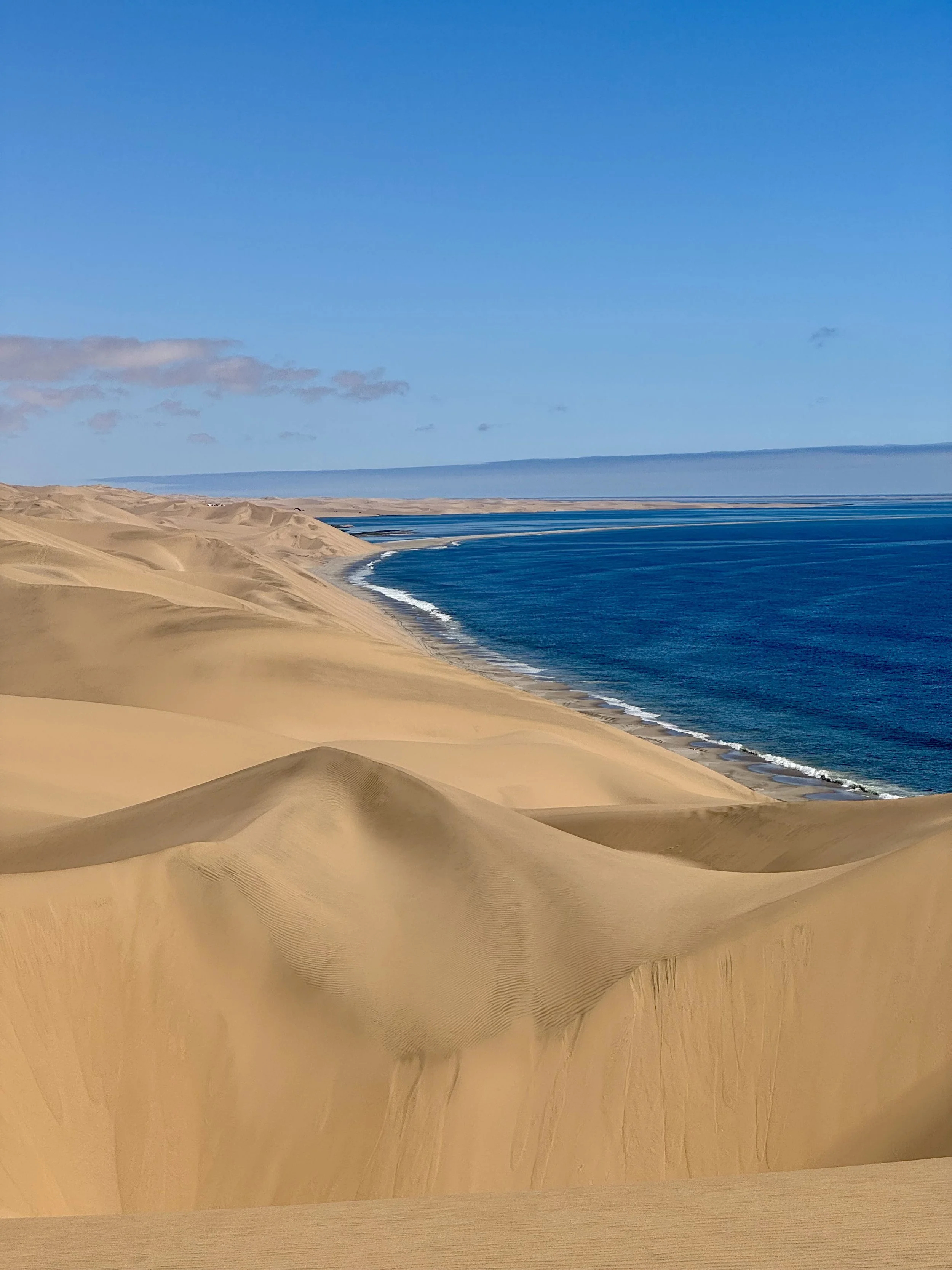 We arrived in Walvis Bay, Namibia, and todayโs adventure promised to be something truly special. The morning began with a 4x4 excursion through the towering sand dunes of the Namib Desert! Never have we expected such a surreal experience as we drifted over sand dunes as big as hills and drove along the shore line of the South Atlantic Ocean. At times it felt like driving across another planet. We stopped to admire desert-adapted flora and fauna and took in views that truly redefined the word โvast.โ