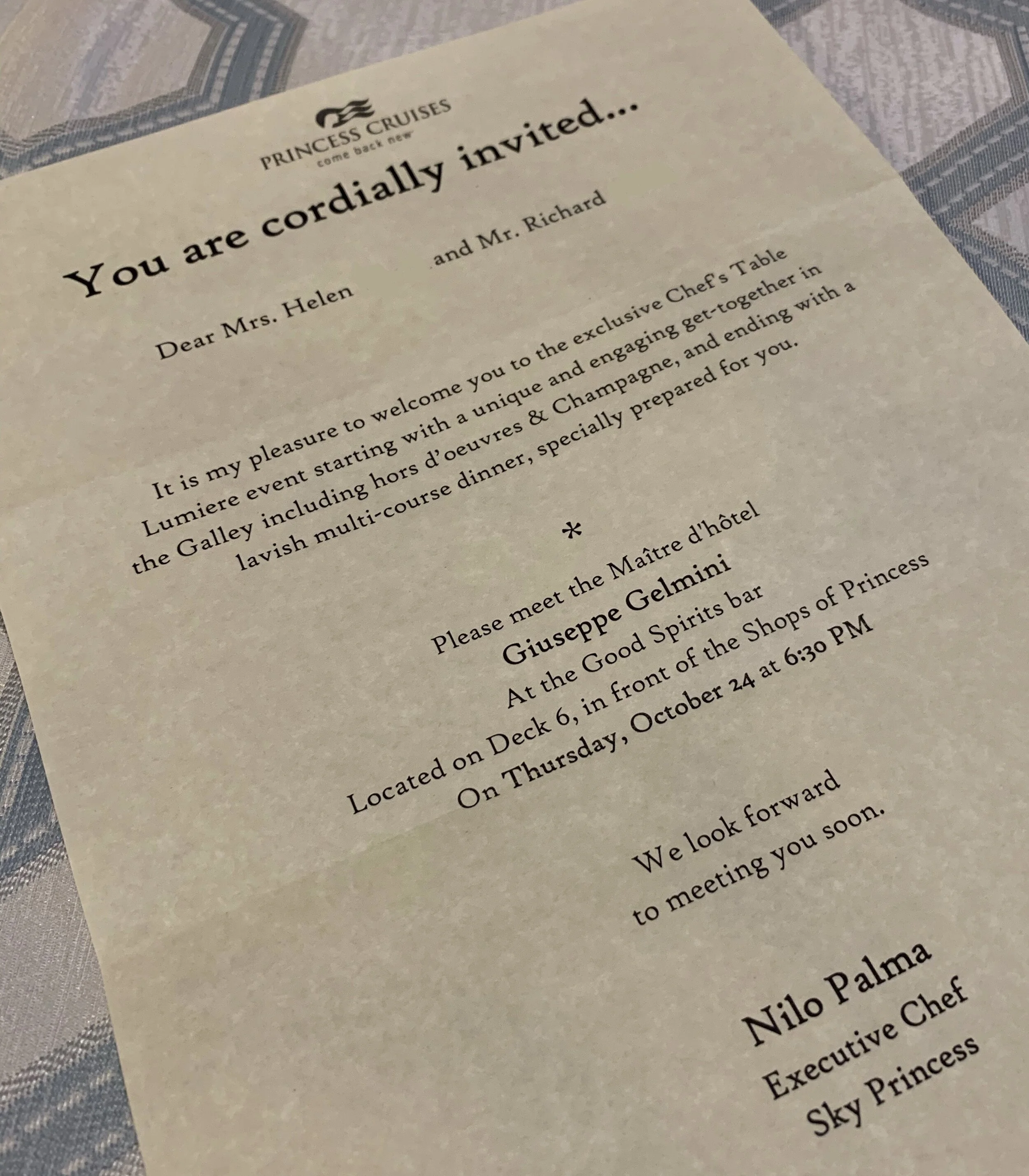 Having put our names on the waiting list for the Chef’s Table within a few hours of boarding we were absolutely delighted to receive an invitation to this very special evening, which started in the Good Spirits bar where we joined the other 10 diners we would be sharing it with. We were greeted by the maitre’d who escorted us to Estrella restaurant where we were all alighted of any jackets we were wearing and adorned with oversized lab coats.